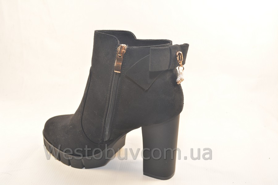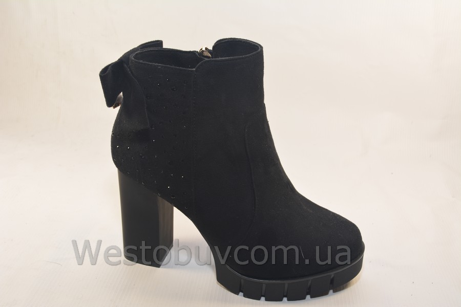 Ботинки женские оптом Женские ботильоны на высоком, но удобном каблуке, из эко замши. Модель украшена стразами черного цвета и бантом на пятке. Застежка молния с внутренней стороны. Оптимальная цена за качественную зимнюю обувь.