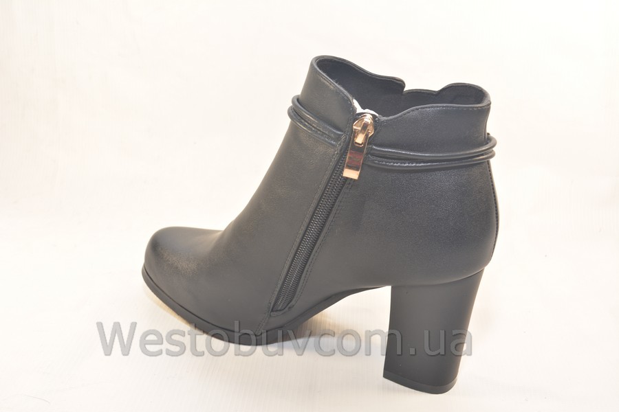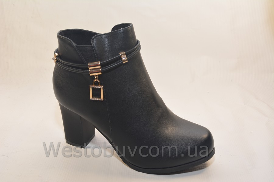 Ботинки женские оптом Классические женские ботильоны на высоком, но удобном каблуке. Модель украшена тонкими жгутами и брошью "под золото". Внутри теплый мех. Удобная колодка, высочайшее качество материалов.