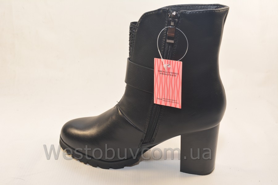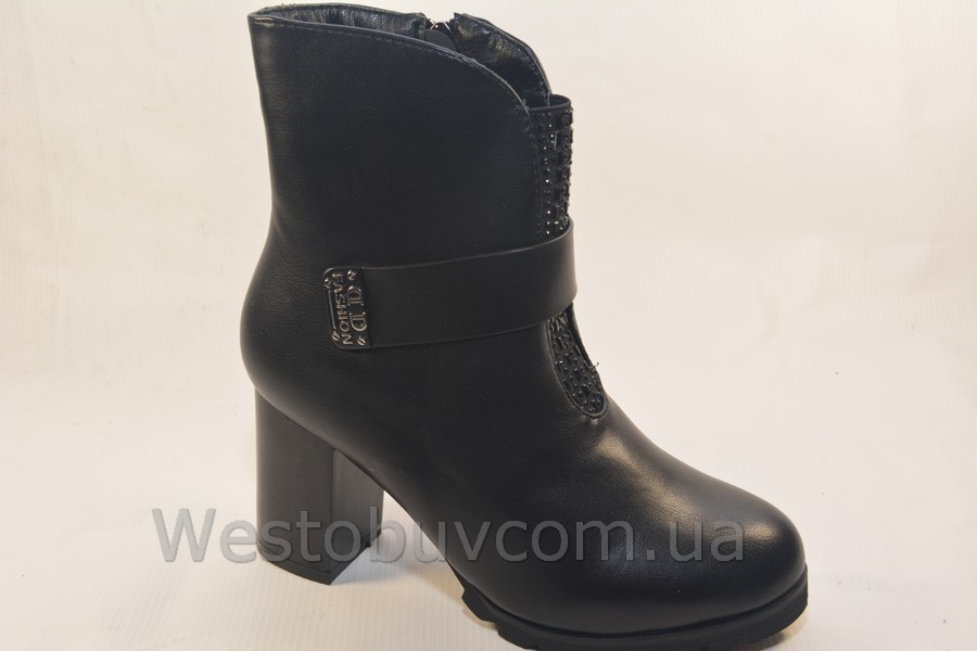 Стильные женские ботильоны на невысоком устойчивом каблуке. Модель с закругленным носом выполнена из эко кожи и украшена декоративным ремешком с серебристой пряжкой на голенище. Украшает ботинок также вставка на язычке из стразов черного цвета. Модель застегивается на тонкую молнию на внутренней стороне.